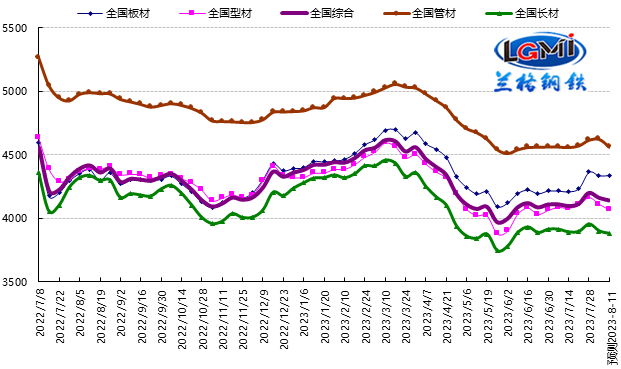 2023年第31周(2023.7.31-8.4)蘭格鋼鐵全國價(jià)格指數為4159元,較上周下降0.9%,較去年同期下降5.3%。其中,蘭格鋼鐵長(cháng)材價(jià)格指數為3898元,較上周下降1.3%,較去年同期下降9.8%;蘭格鋼鐵型材價(jià)格指數為4111元,較上周下降1.3%,較去年同期下降6.2%;蘭格鋼鐵板材價(jià)格指數為4335元,較上周下降0.7%,較去年同期下降0.5%;蘭格鋼鐵管材價(jià)格指數為4624元,較上周上升0.1%,較去年同期下降7.1%。