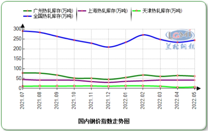 5月份熱卷庫存據蘭格鋼結束去庫行情,庫存表現為累庫狀態(tài)。據蘭格鋼鐵網(wǎng)監測數據顯示,本月底國內熱軋卷板社會(huì )庫存量約為243.71萬(wàn)噸,環(huán)比增加10.72萬(wàn)噸。重點(diǎn)城市庫存整體表現不一,華東、華南庫存小幅下降,華北區域天津社會(huì )庫存有所增加。具體來(lái)看,廣州地區熱卷社會(huì )庫存量約為61.91萬(wàn)噸,環(huán)比下降3.05萬(wàn)噸;上海熱卷社會(huì )庫存量環(huán)比減少0.21萬(wàn)噸至41.84萬(wàn)噸;天津熱卷社會(huì )庫存量約為7.20萬(wàn)噸,環(huán)比增加1.58萬(wàn)噸。