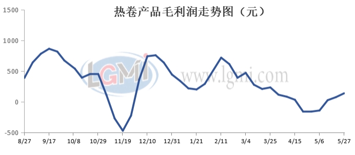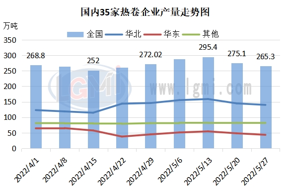 熱卷產(chǎn)量小幅下降。截止到5月27日,國內35家熱劇企業(yè)產(chǎn)量為265.3萬(wàn)噸,較4月底下降6.72萬(wàn)噸或2.47%,但仍處于相對高位。受熱卷需求以及鋼廠(chǎng)利潤壓力等方面影響,部分鋼廠(chǎng)熱卷軋線(xiàn)有所檢修利空產(chǎn)量相比上月底小幅下降。