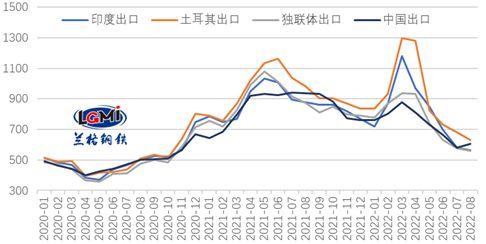 7月份,出口市場(chǎng)競爭激烈,主要出口國繼續下調鋼材出口報價(jià)。進(jìn)入8月份,海外需求持續疲弱,各國鋼材出口報價(jià)仍有所下調,而國內市場(chǎng)出現反彈,出口報價(jià)有所上漲,蘭格鋼鐵云商平臺監測數據顯示,2022年8月5日,印度、土耳其、獨聯(lián)體熱軋卷板出口報價(jià)(FOB)分別為565美元/噸、630美元/噸和560美元/噸,均較7月底有所下跌,中國熱軋卷板出口報價(jià)(FOB)為605美元/噸,較7月底有所上漲。