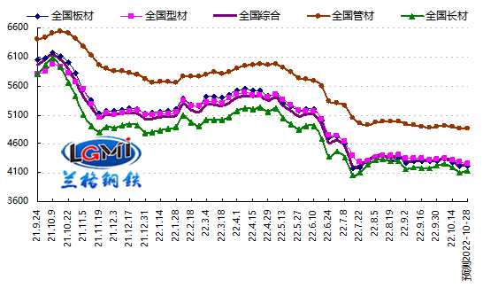 2022年第43周(2022.10.17-10.21)蘭格鋼鐵全國絕對價(jià)格指數為4223元,較上周下降1.6%,較去年同期下降29.2%。其中,蘭格鋼鐵長(cháng)材絕對價(jià)格指數為4103元,較上周下降2.2%,較去年同期下降29.0%;蘭格鋼鐵型材絕對價(jià)格指數為4281元,較上周下降0.8%,較去年同期下降27.4%;蘭格鋼鐵板材絕對價(jià)格指數為4211元,較上周下降1.5%,較去年同期下降30.6%;蘭格鋼鐵管材絕對價(jià)格指數為4868元,較上周下降0.5%,較去年同期下降25.5%。