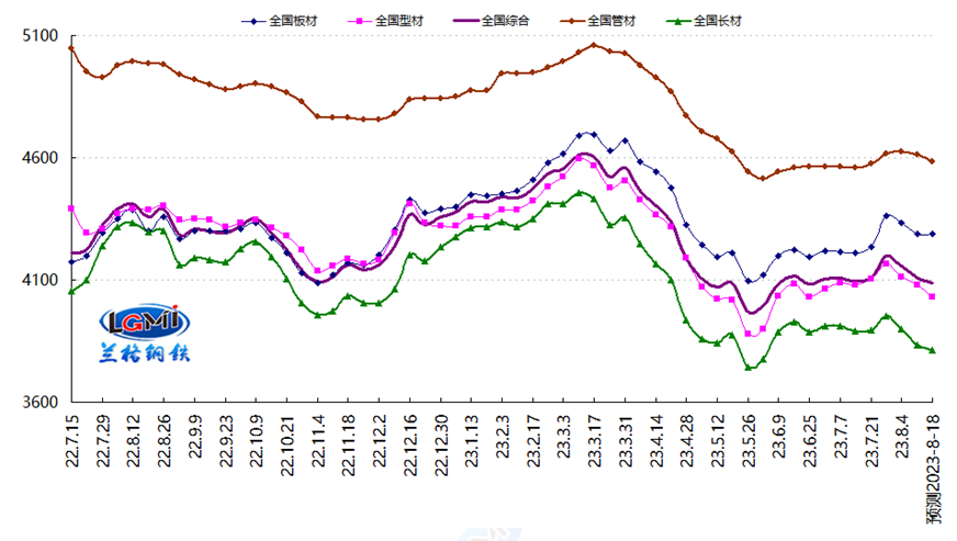 2023年第32周(2023.8.7-8.11)蘭格鋼鐵全國價(jià)格指數為4108元,較上周下降1.2%,較去年同期下降6.6%。其中,蘭格鋼鐵長(cháng)材價(jià)格指數為3834元,較上周下降1.6%,較去年同期下降11.3%;蘭格鋼鐵型材價(jià)格指數為4081元,較上周下降0.8%,較去年同期下降6.9%;蘭格鋼鐵板材價(jià)格指數為4287元,較上周下降1.0%,較去年同期下降1.9%;蘭格鋼鐵價(jià)格指數為4612元,較上周下降0.3%,較去年同期下降7.7%。