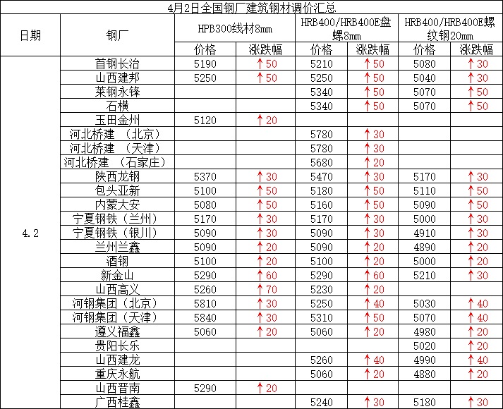 4月2日全國鋼廠(chǎng)建筑鋼材調價(jià)匯總